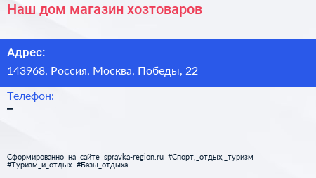 Наш дом, магазин хозтоваров по адресу 143968, Россия, Москва, Победы, 22 в дальнейшем Организация, размещена в следующих категориях: