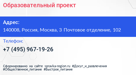 Образовательный проект по адресу 140008, Россия, Москва, 3 Почтовое отделение, 102 в дальнейшем Организация, размещена в следующих категориях: