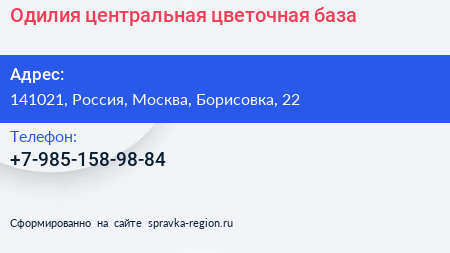Одилия, центральная цветочная база по адресу 141021, Россия, Москва, Борисовка, 22 в дальнейшем Организация, размещена в следующих категориях: