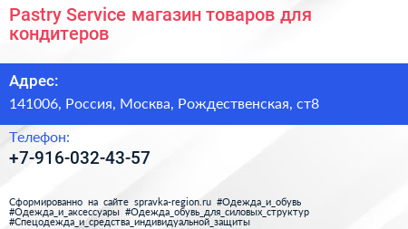 Pastry Service, магазин товаров для кондитеров по адресу 141006, Россия, Москва, Рождественская, ст8 в дальнейшем Организация, размещена в следующих категориях: