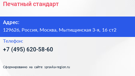 Печатный стандарт по адресу 129626, Россия, Москва, Мытищинская 3-я, 16 ст2 в дальнейшем Организация, размещена в следующих категориях: