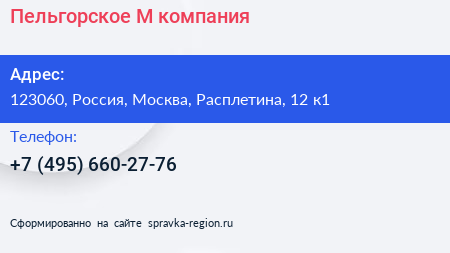 Пельгорское-М, компания по адресу 123060, Россия, Москва, Расплетина, 12 к1 в дальнейшем Организация, размещена в следующих категориях: