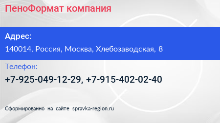 ПеноФормат, компания по адресу 140014, Россия, Москва, Хлебозаводская, 8 в дальнейшем Организация, размещена в следующих категориях: