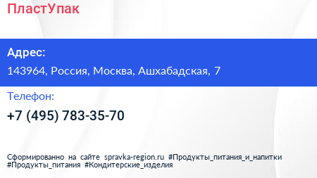 ПластУпак по адресу 143964, Россия, Москва, Ашхабадская, 7 в дальнейшем Организация, размещена в следующих категориях:
