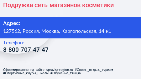 Подружка, сеть магазинов косметики по адресу 127562, Россия, Москва, Каргопольская, 14 к1 в дальнейшем Организация, размещена в следующих категориях: