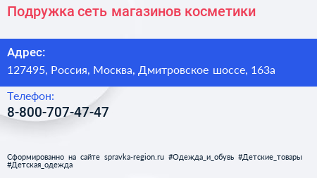 Подружка, сеть магазинов косметики по адресу 127495, Россия, Москва, Дмитровское шоссе, 163а в дальнейшем Организация, размещена в следующих категориях: