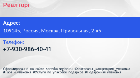 Реалторг по адресу 109145, Россия, Москва, Привольная, 2 к5 в дальнейшем Организация, размещена в следующих категориях: