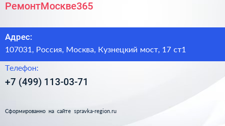 РемонтМоскве365 по адресу 107031, Россия, Москва, Кузнецкий мост, 17 ст1 в дальнейшем Организация, размещена в следующих категориях: