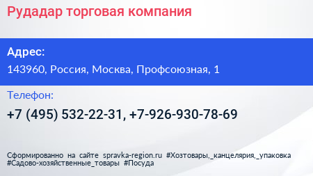 Рудадар, торговая компания по адресу 143960, Россия, Москва, Профсоюзная, 1 в дальнейшем Организация, размещена в следующих категориях: