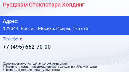 Русджам Стеклотара Холдинг по адресу 129344, Россия, Москва, Искры, 17а ст3 в дальнейшем Организация, размещена в следующих категориях:
