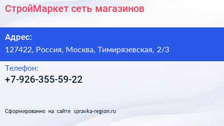 СтройМаркет, сеть магазинов по адресу 127422, Россия, Москва, Тимирязевская, 2/3 в дальнейшем Организация, размещена в следующих категориях: