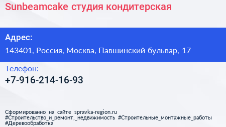 Sunbeamcake, студия-кондитерская по адресу 143401, Россия, Москва, Павшинский бульвар, 17 в дальнейшем Организация, размещена в следующих категориях: