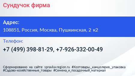Сундучок, фирма по адресу 108851, Россия, Москва, Пушкинская, 2 к2 в дальнейшем Организация, размещена в следующих категориях: