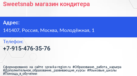 Sweetsnab, магазин кондитера по адресу 141407, Россия, Москва, Молодёжная, 1 в дальнейшем Организация, размещена в следующих категориях: