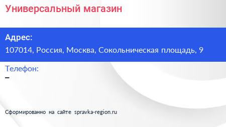 Универсальный магазин по адресу 107014, Россия, Москва, Сокольническая площадь, 9 в дальнейшем Организация, размещена в следующих категориях: