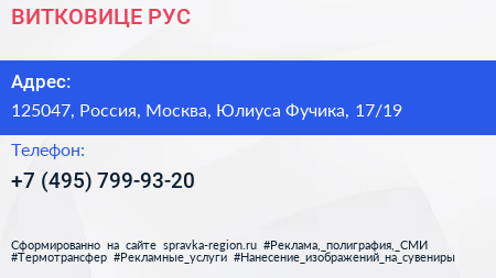 ВИТКОВИЦЕ РУС по адресу 125047, Россия, Москва, Юлиуса Фучика, 17/19 в дальнейшем Организация, размещена в следующих категориях: