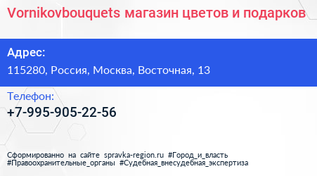Vornikovbouquets, магазин цветов и подарков по адресу 115280, Россия, Москва, Восточная, 13 в дальнейшем Организация, размещена в следующих категориях: