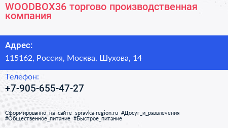 WOODBOX36, торгово-производственная компания по адресу 115162, Россия, Москва, Шухова, 14 в дальнейшем Организация, размещена в следующих категориях: