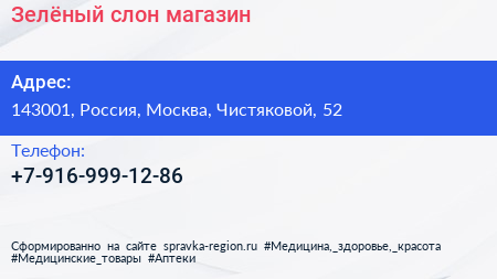 Зелёный слон, магазин по адресу 143001, Россия, Москва, Чистяковой, 52 в дальнейшем Организация, размещена в следующих категориях: