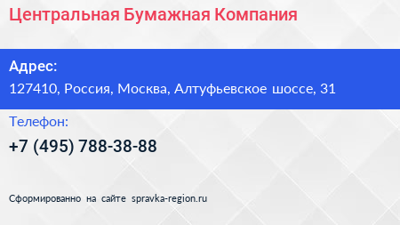 Центральная Бумажная Компания по адресу 127410, Россия, Москва, Алтуфьевское шоссе, 31 в дальнейшем Организация, размещена в следующих категориях: