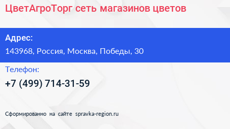 ЦветАгроТорг, сеть магазинов цветов по адресу 143968, Россия, Москва, Победы, 30 в дальнейшем Организация, размещена в следующих категориях: