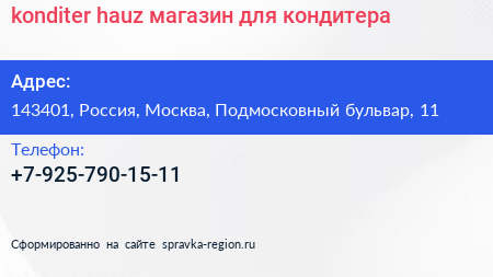 konditer hauz, магазин для кондитера по адресу 143401, Россия, Москва, Подмосковный бульвар, 11 в дальнейшем Организация, размещена в следующих категориях: