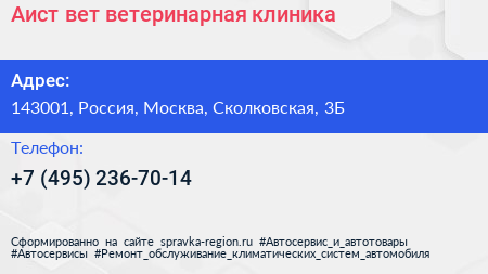 Аист-вет, ветеринарная клиника по адресу 143001, Россия, Москва, Сколковская, 3Б в дальнейшем Организация, размещена в следующих категориях: