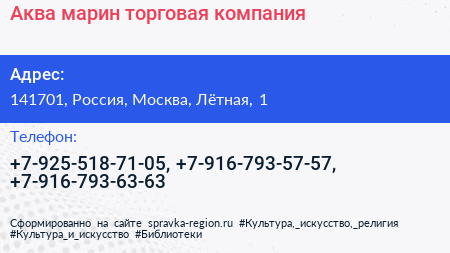 Аква-марин, торговая компания по адресу 141701, Россия, Москва, Лётная, 1 в дальнейшем Организация, размещена в следующих категориях: