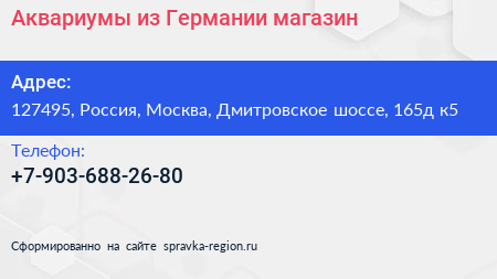 Аквариумы из Германии, магазин по адресу 127495, Россия, Москва, Дмитровское шоссе, 165д к5 в дальнейшем Организация, размещена в следующих категориях: