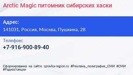 Arctic Magic, питомник сибирских хаски по адресу 141031, Россия, Москва, Пушкина, 28 в дальнейшем Организация, размещена в следующих категориях: