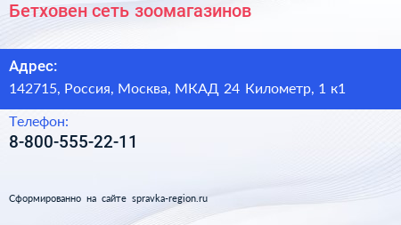 Бетховен, сеть зоомагазинов по адресу 142715, Россия, Москва, МКАД 24 Километр, 1 к1 в дальнейшем Организация, размещена в следующих категориях: