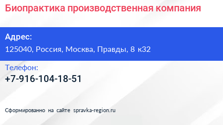 Биопрактика, производственная компания по адресу 125040, Россия, Москва, Правды, 8 к32 в дальнейшем Организация, размещена в следующих категориях: