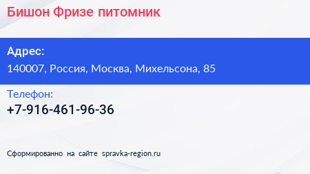 Бишон Фризе, питомник по адресу 140007, Россия, Москва, Михельсона, 85 в дальнейшем Организация, размещена в следующих категориях:
