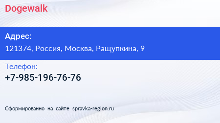 Dogewalk по адресу 121374, Россия, Москва, Ращупкина, 9 в дальнейшем Организация, размещена в следующих категориях: