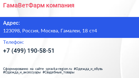 ГамаВетФарм, компания по адресу 123098, Россия, Москва, Гамалеи, 18 ст4 в дальнейшем Организация, размещена в следующих категориях:
