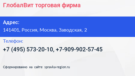 ГлобалВит, торговая фирма по адресу 141401, Россия, Москва, Заводская, 2 в дальнейшем Организация, размещена в следующих категориях:
