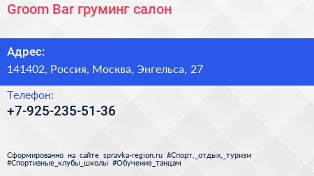 Groom Bar, груминг-салон по адресу 141402, Россия, Москва, Энгельса, 27 в дальнейшем Организация, размещена в следующих категориях: