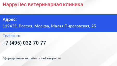 HappyПёс, ветеринарная клиника по адресу 119435, Россия, Москва, Малая Пироговская, 25 в дальнейшем Организация, размещена в следующих категориях: