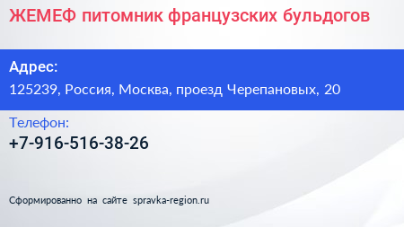 ЖЕМЕФ, питомник французских бульдогов по адресу 125239, Россия, Москва, проезд Черепановых, 20 в дальнейшем Организация, размещена в следующих категориях: