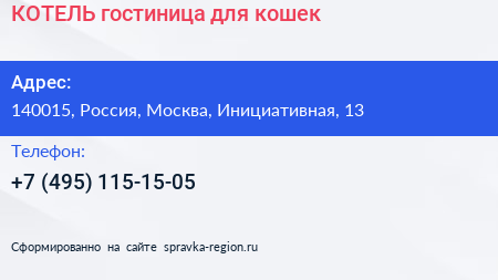 КОТЕЛЬ, гостиница для кошек по адресу 140015, Россия, Москва, Инициативная, 13 в дальнейшем Организация, размещена в следующих категориях: