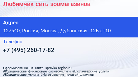 Любимчик, сеть зоомагазинов по адресу 127540, Россия, Москва, Дубнинская, 12Б ст10 в дальнейшем Организация, размещена в следующих категориях: