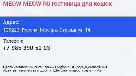 MEOW-MEOW.RU, гостиница для кошек по адресу 125222, Россия, Москва, Барышиха, 14 в дальнейшем Организация, размещена в следующих категориях: