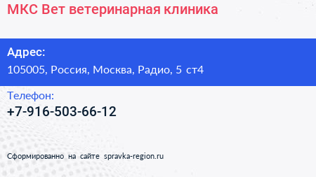 МКС Вет, ветеринарная клиника по адресу 105005, Россия, Москва, Радио, 5 ст4 в дальнейшем Организация, размещена в следующих категориях: