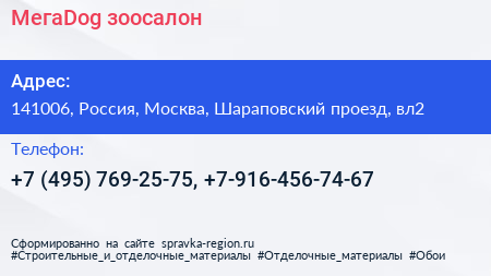 МегаDog, зоосалон по адресу 141006, Россия, Москва, Шараповский проезд, вл2 в дальнейшем Организация, размещена в следующих категориях: