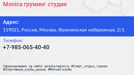 Monica, груминг-студия по адресу 119021, Россия, Москва, Фрунзенская набережная, 2/1 в дальнейшем Организация, размещена в следующих категориях: