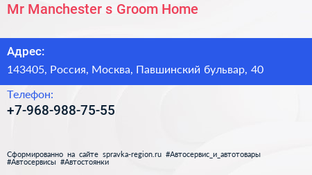 Mr.Manchester’s Groom Home по адресу 143405, Россия, Москва, Павшинский бульвар, 40 в дальнейшем Организация, размещена в следующих категориях: