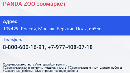 PANDA-ZOO, зоомаркет по адресу 109429, Россия, Москва, Верхние Поля, вл56в в дальнейшем Организация, размещена в следующих категориях: