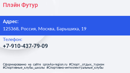 Плэйн Футур по адресу 125368, Россия, Москва, Барышиха, 19 в дальнейшем Организация, размещена в следующих категориях: