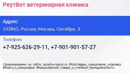 РеутВет, ветеринарная клиника по адресу 143965, Россия, Москва, Октября, 3 в дальнейшем Организация, размещена в следующих категориях: