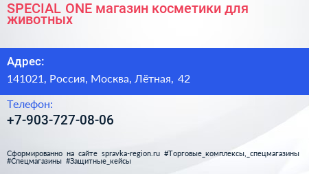 SPECIAL ONE, магазин косметики для животных по адресу 141021, Россия, Москва, Лётная, 42 в дальнейшем Организация, размещена в следующих категориях:
